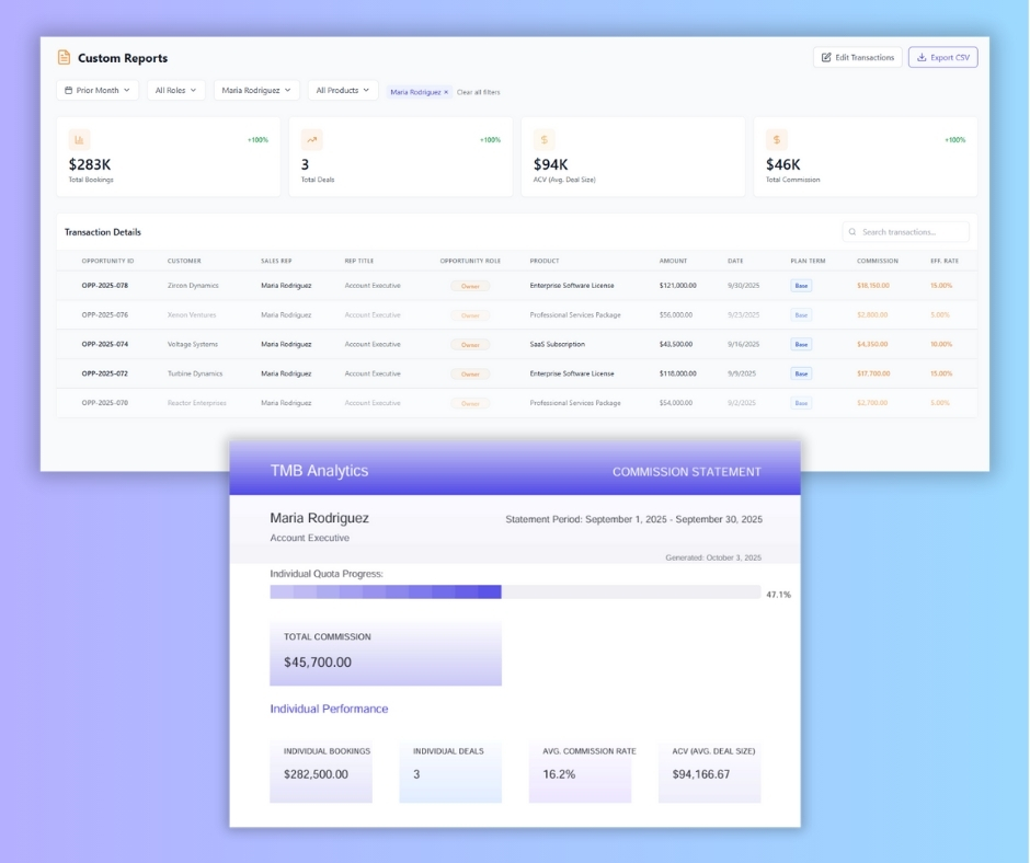 Give your sales team real-time dashboards so they always know exactly what they've earned. No more shadow accounting.